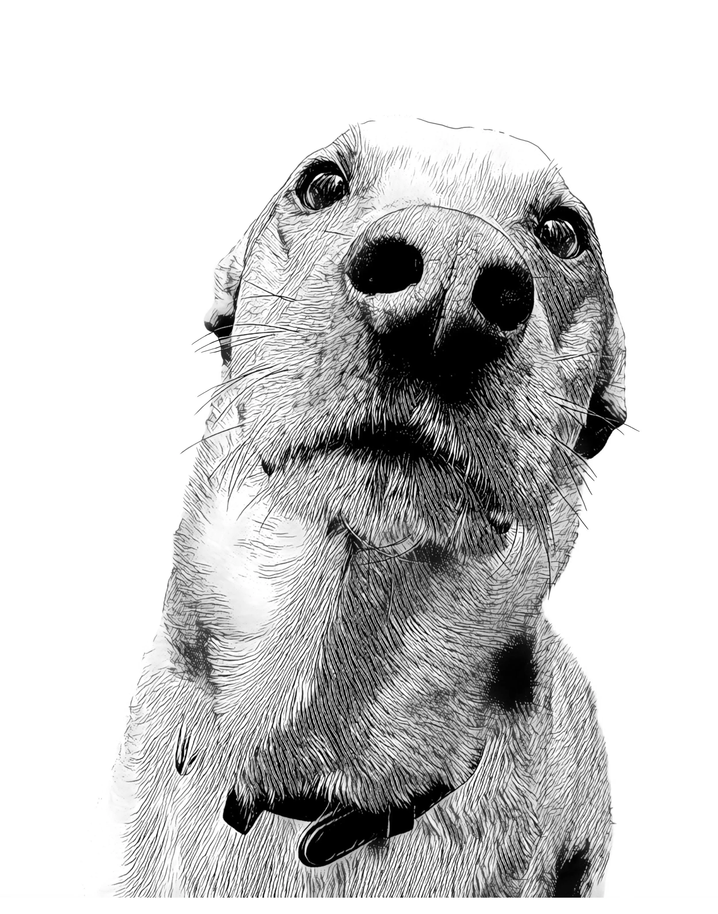My black-and-white work is where emotion leads the way. Through linocut prints and drawings, I focus on detail, contrast, and expression to bring out what feels most present in each subject. Animals often carry joy, kindness, calm, and warmth—the steady, grounding presence I return to again and again. Even when humor slips in, it’s gentle and intentional, woven into the personality of the piece rather than placed on top of it.
